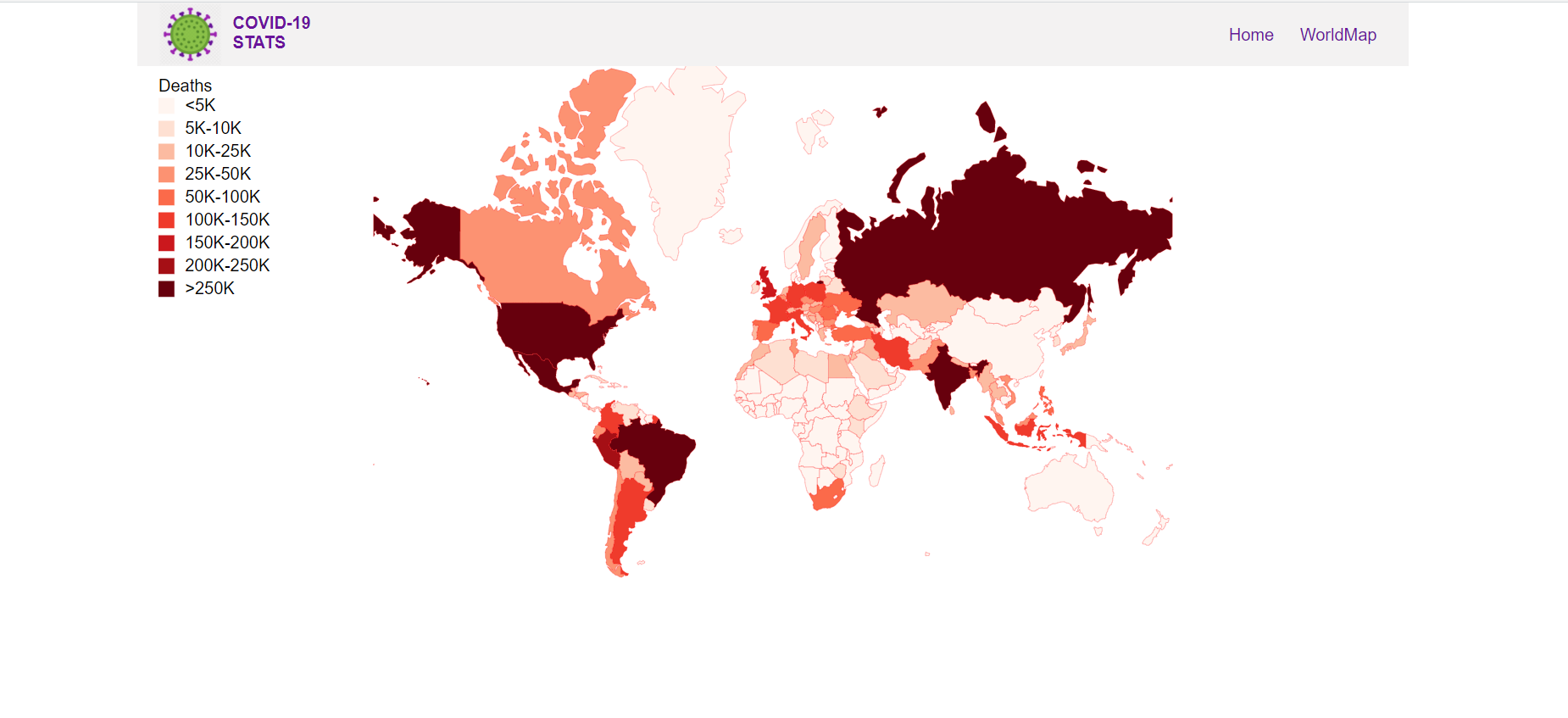This application visualizes covid data. There is a line chart visualization in the homepage where we can select countries to see information relating to total covid cases, recovered cases and death cases. There is a world map visualization where we can hover over countries to find information on covid cases for that particular country. This worldmap puts into perspective where in the world covid has mostly affected.